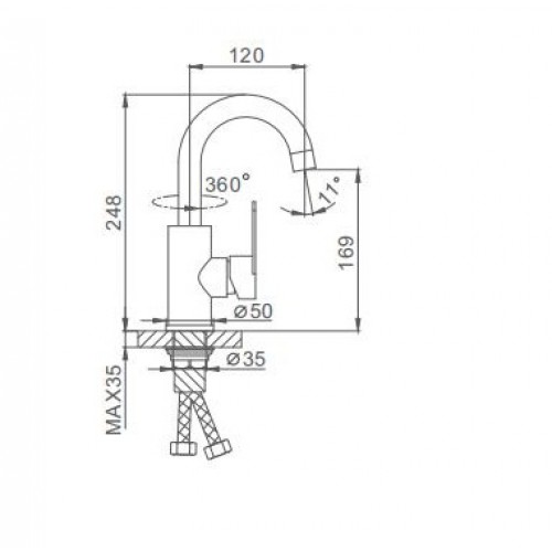 Frap смеситель для раковины, однорычажный, излив короткий поворотный, керамический катридж 35mm, цвет нержавейка, крепление на гайке, корпус нержавейка, гибкая подводка 35см.Артикул 44913 Марка: Frap Назначение: для раковины Цвет: нержавейка