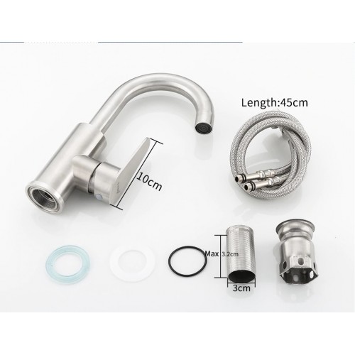 Frap смеситель для раковины, однорычажный, излив короткий поворотный, керамический катридж 35mm, цвет нержавейка, крепление на гайке, корпус нержавейка, гибкая подводка 35см.Артикул 44913 Марка: Frap Назначение: для раковины Цвет: нержавейка