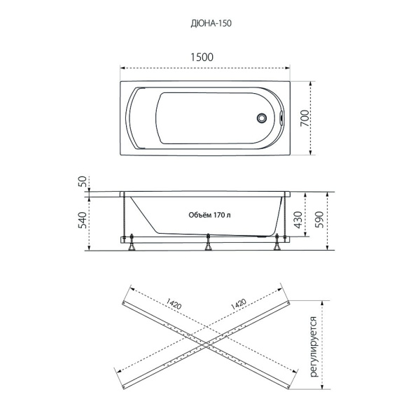 Ванна акриловая Dune 150*70 на каркасе с экраном