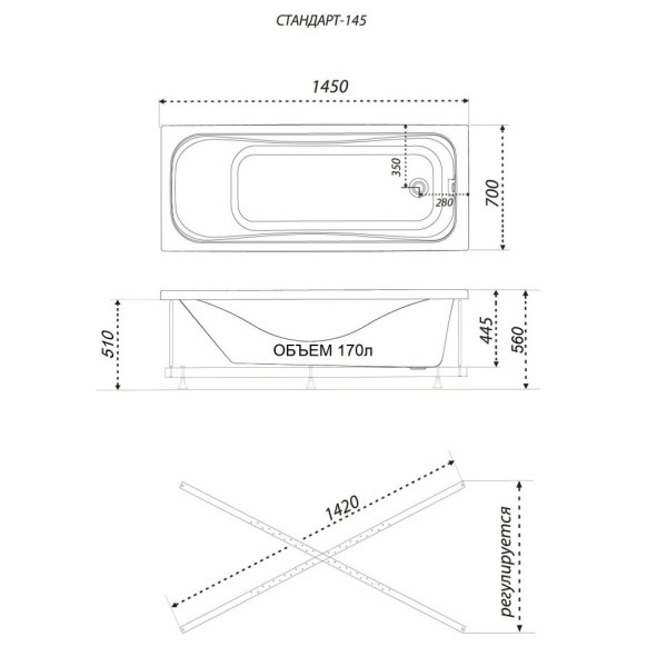 | Ванна акриловая Стандарт 145*70 на каркасе с экраном |